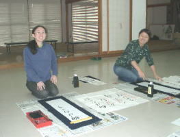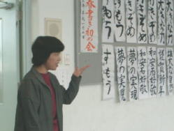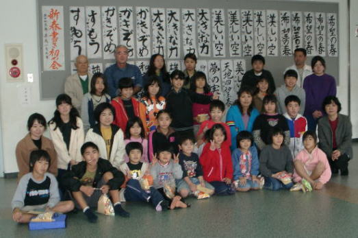 | 参加者全員で記念撮影・・・・32点の書き初めを展示 |